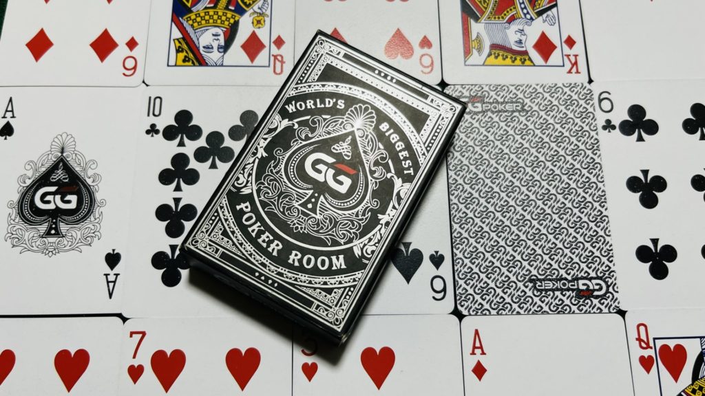 GGPOKERが提供するカードは、スペードのエースにGGのマークが特徴的です。今回のデザインは背面にもGGのロゴが大胆にデザインされています。これらのカードはGGStoreで購入でき、カナダから輸出されるため、支払いはドルベースとなります。