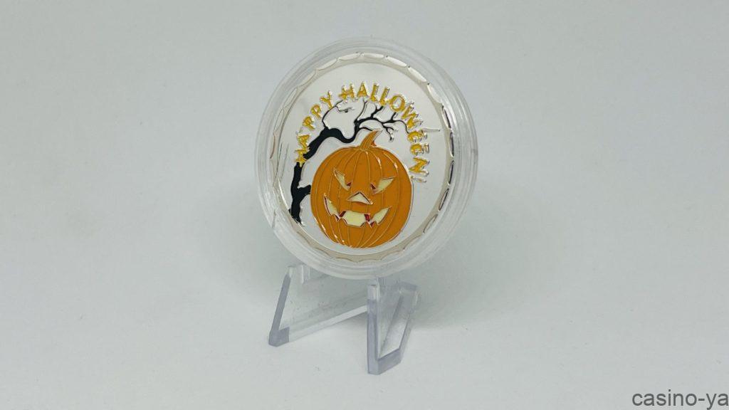 表面には「HAPPY HALLOWEEN」という文字が刻まれ、ジャックオランタンのイラストが追加されています。裏面のデザインは、青色の夜空に輝く大きな満月が描かれ、その上を魔女が箒で飛んでいる様子が表現されています。